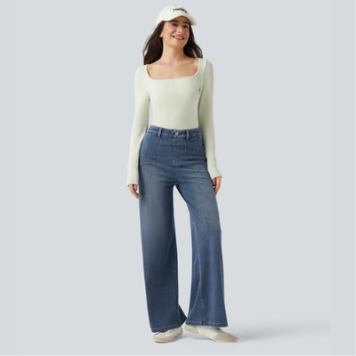 VAQUEROS INFORMALES ELÁSTICOS LAVADOS DE PUNTO ELÁSTICO CON CINTURA ALTA, MÚLTIPLES BOLSILLOS Y PIERNA ANCHA, PANTALONES VAQUEROS PARA MUJER